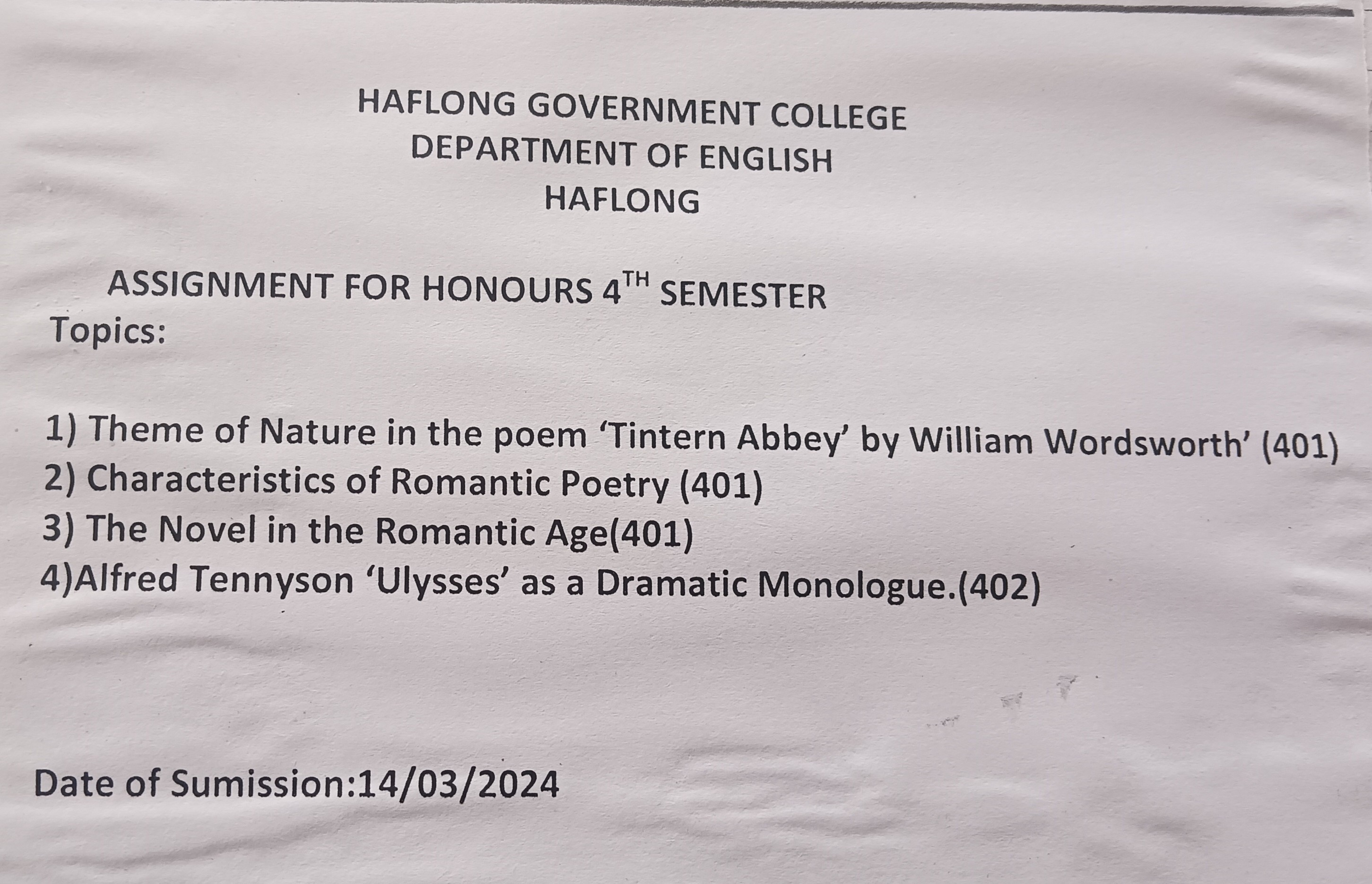| Assignment | Haflong Government College Department of English Haflong Assignment Topics for Honours 4th Semester. | 2024-03-01 | View File |