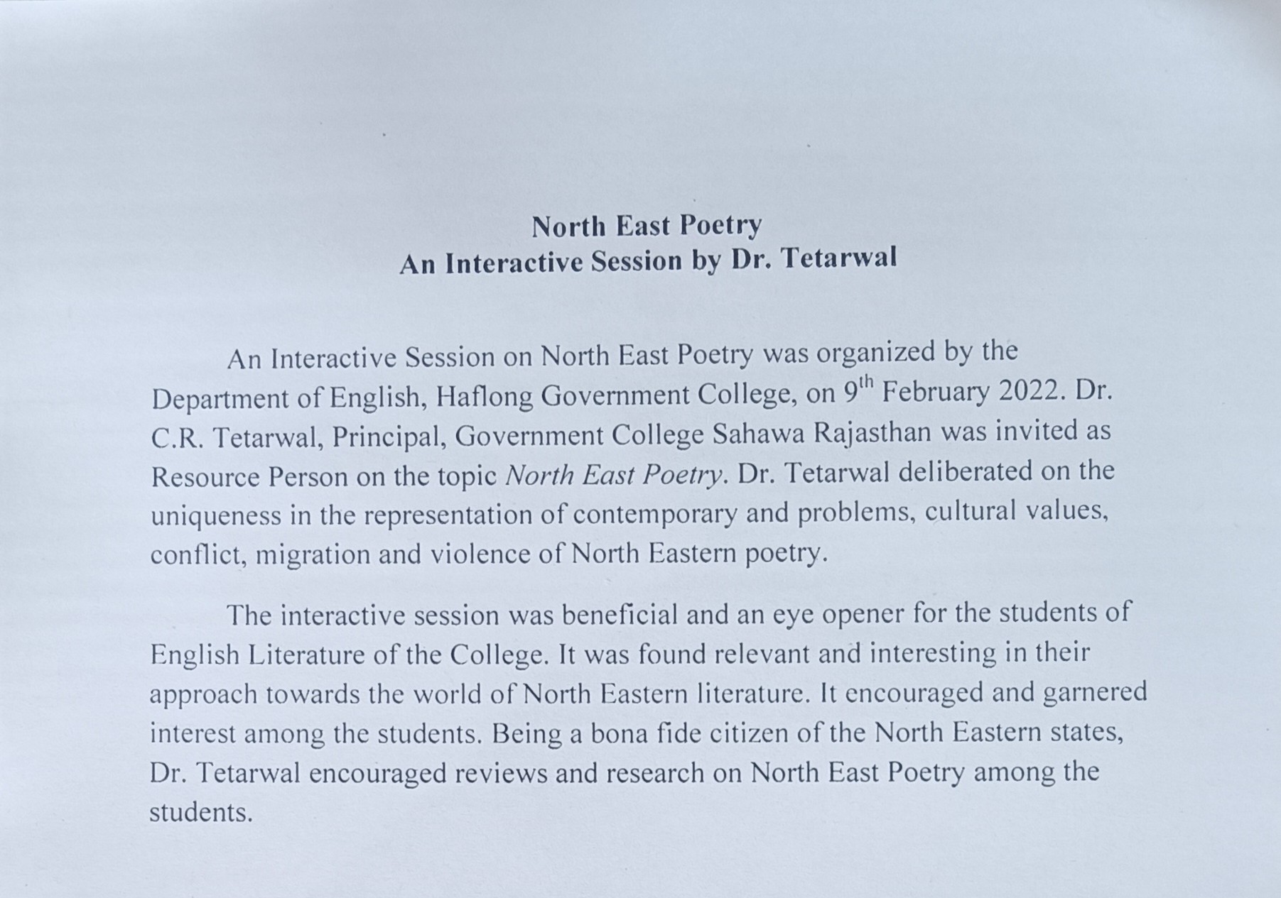 | An Interactive Session | North East Poetry An Interactive Session by Dr.Tetarwal. | 2024-03-15 | View File |