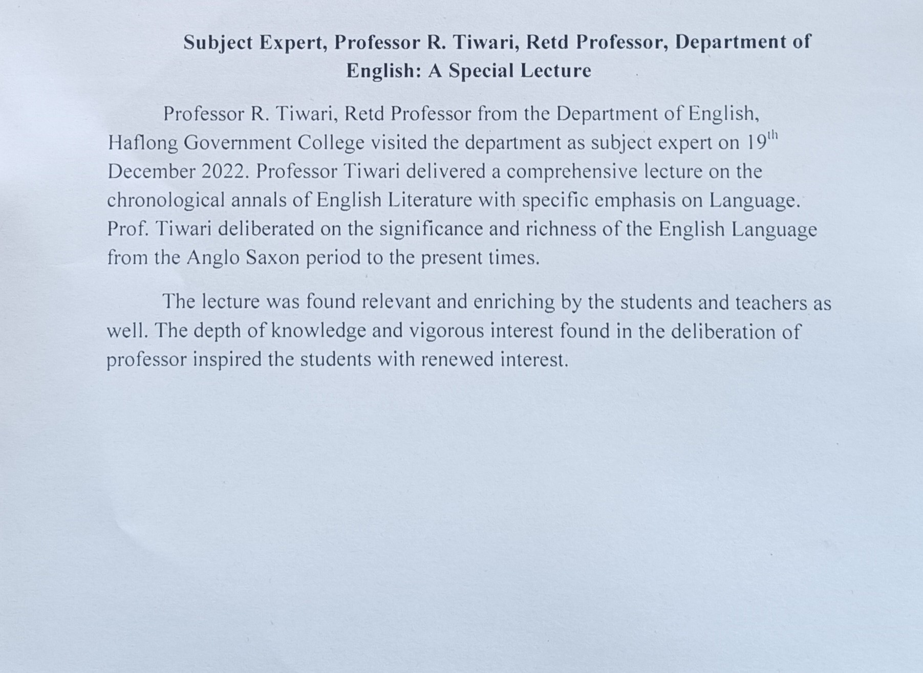 | A Special Lecture | Subject Expert, Professor R.Tiwari ,Retd Professor, Department of English:A Special Lecture. | 2024-03-15 | View File |