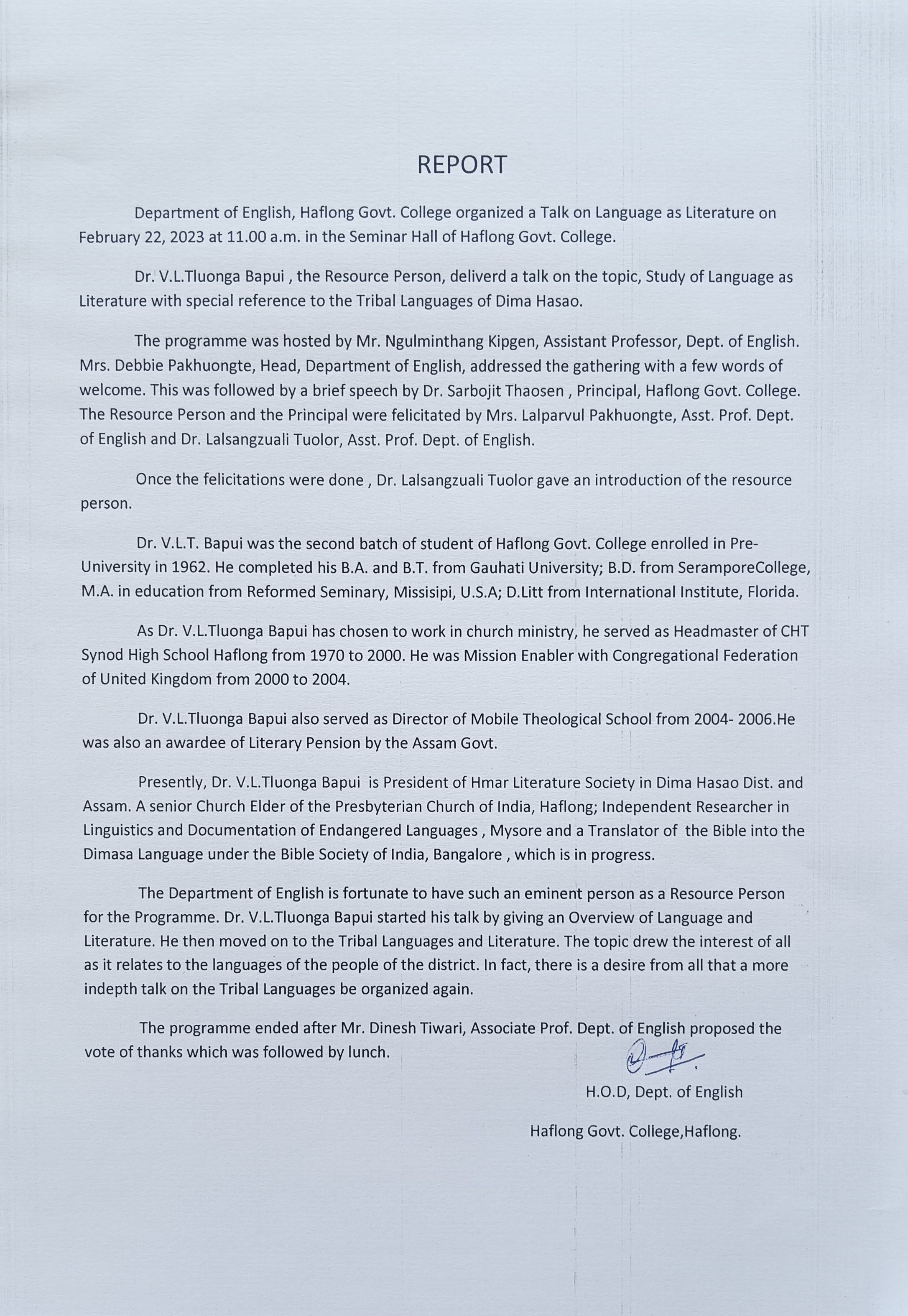 | Talk on Study of Language as literature with special reference to the Tribal languages of Dima Hasao | Dr. V.L.Tluonga Bapui as a Resource Person | 2025-02-22 | View File |