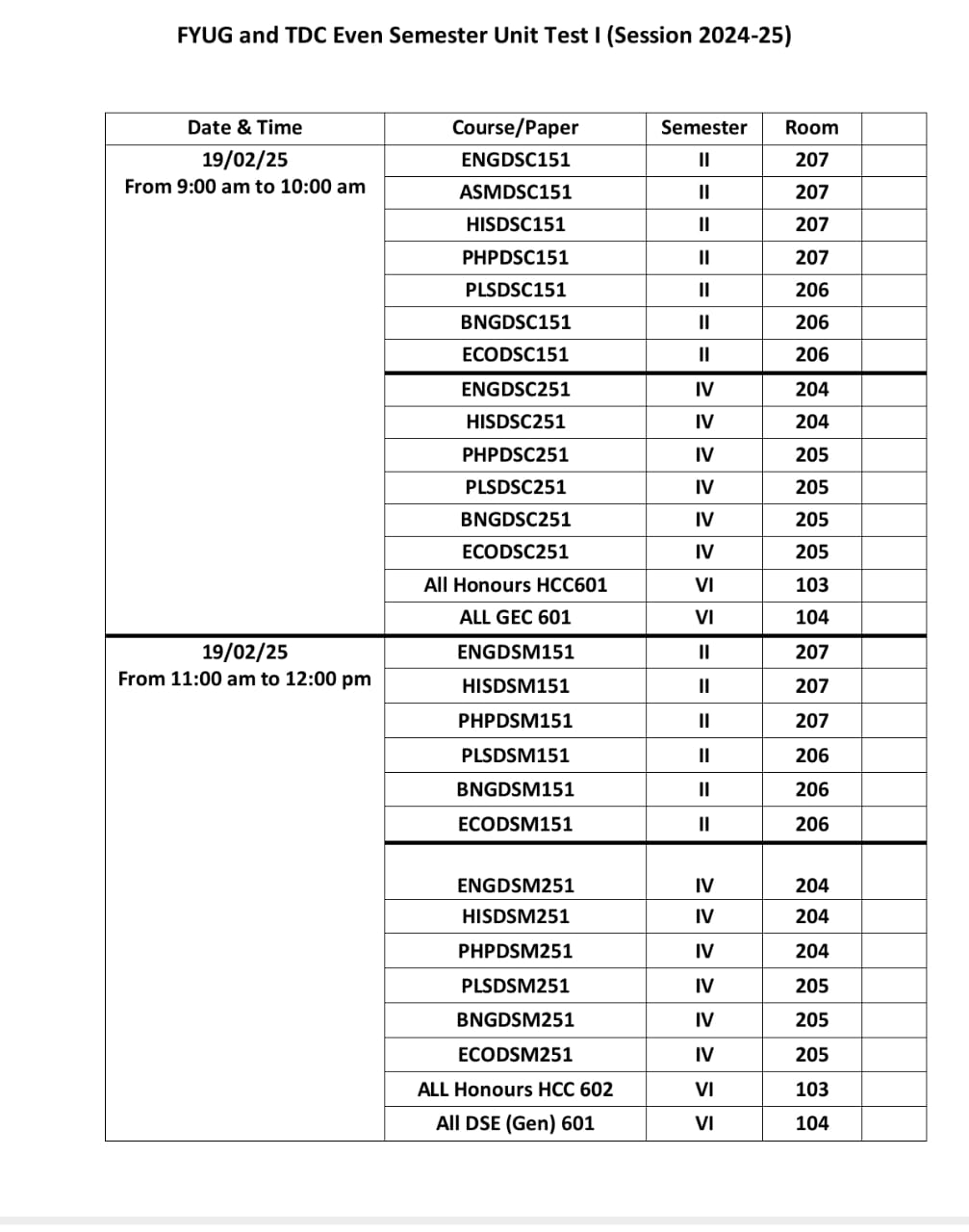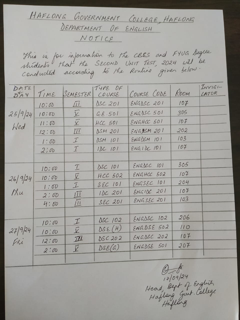 | Dept of English Unit Test 1 Room allocation View 0000-00-00 |
