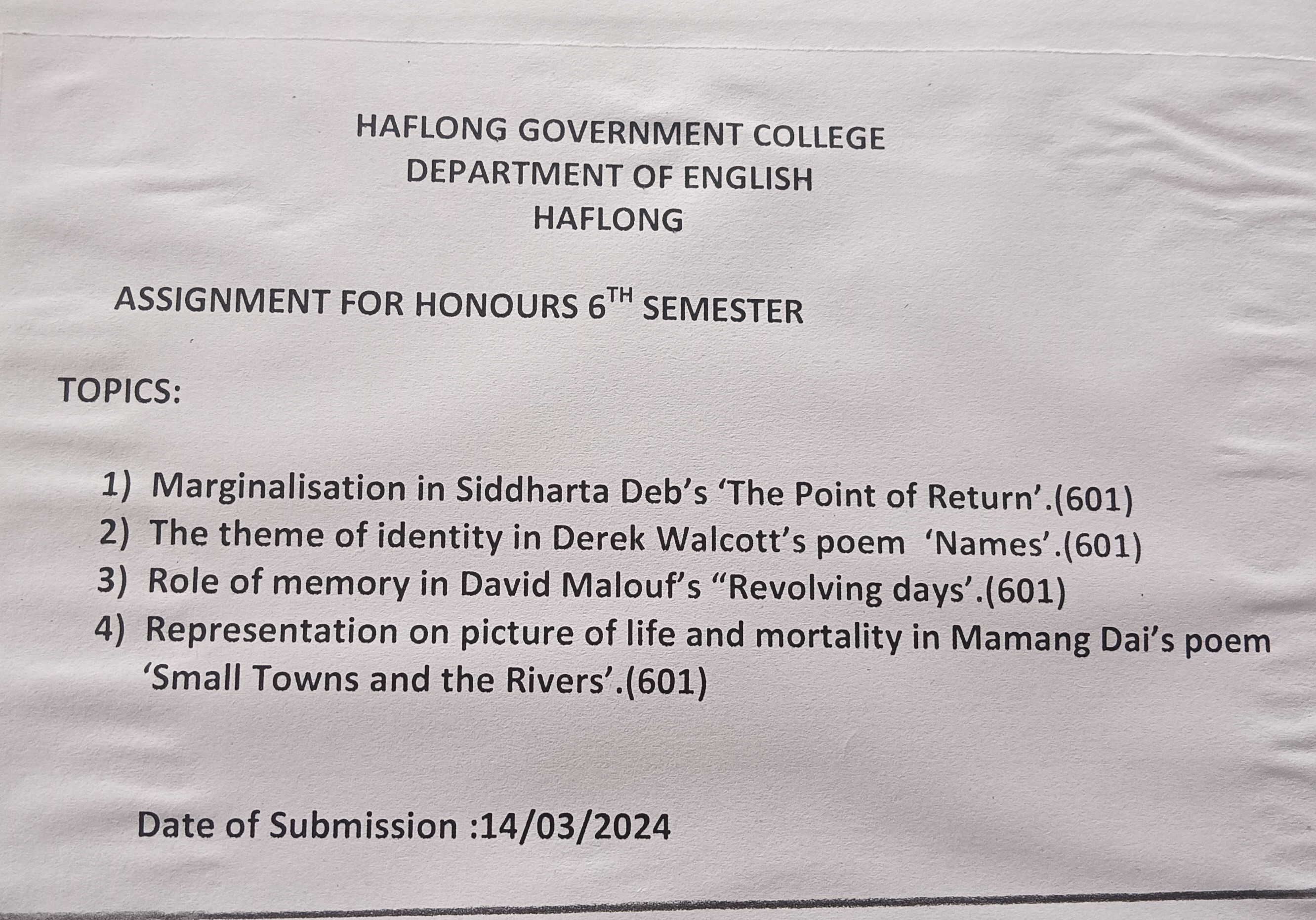 | Assignment | Haflong Government College Department of English Haflong Assignment Topics for Honours 6th Semester | 2024-03-01 | View File |