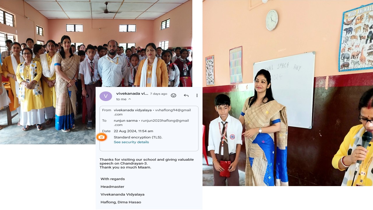 | 58 | Delivered an invited talk -Dr. Runjun Sarma, Dept. of Physics, Haflong Government College | Delivered and invited lecture on the "Success of Chandrayan-3 mission" on the occasion of celebration of National Space Day at Vivekananda Vidyalaya, Haflong. | 2024-08-22 | View File |